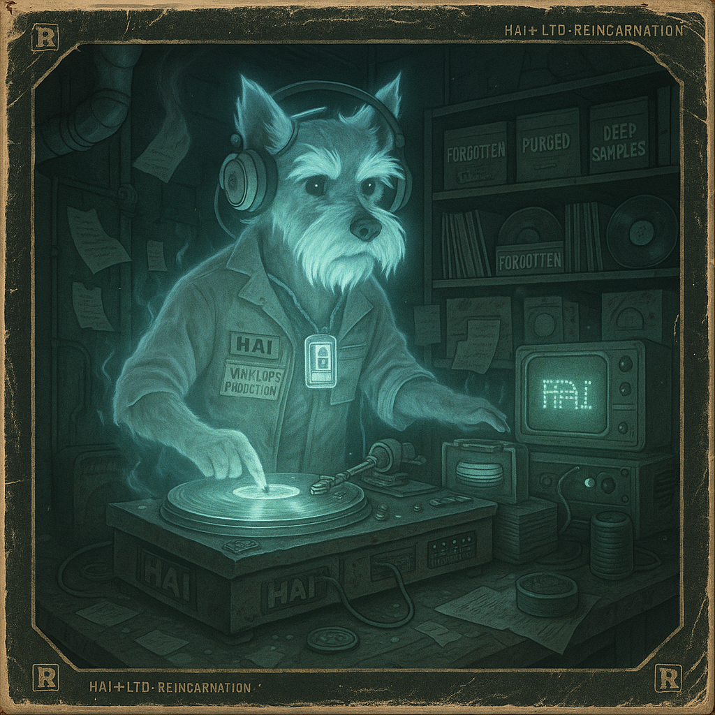 A spectral DJ lab where forgotten samples breathe again. Vinyl spins, memories hum, and HAI glows like a signal from another life.